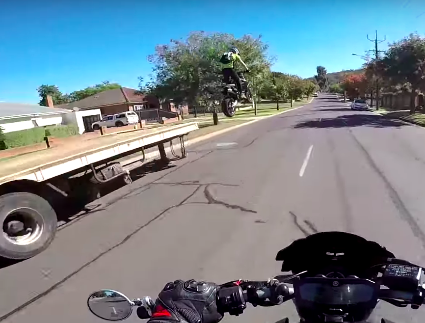 But as he approaches the balance point, a spurt of throttle sends him tipping backwards and crashing painfully to the ground. Ouch.