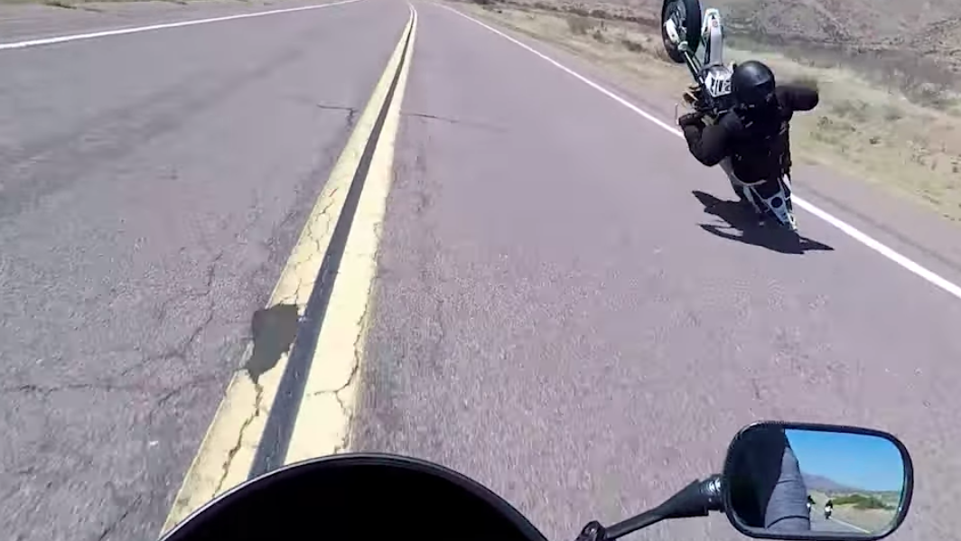 In the clip filmed near Borrego Springs, California, he can be seen overtaking his filming mate on his Husqvarna 701 Supermoto before hoicking a big'un.