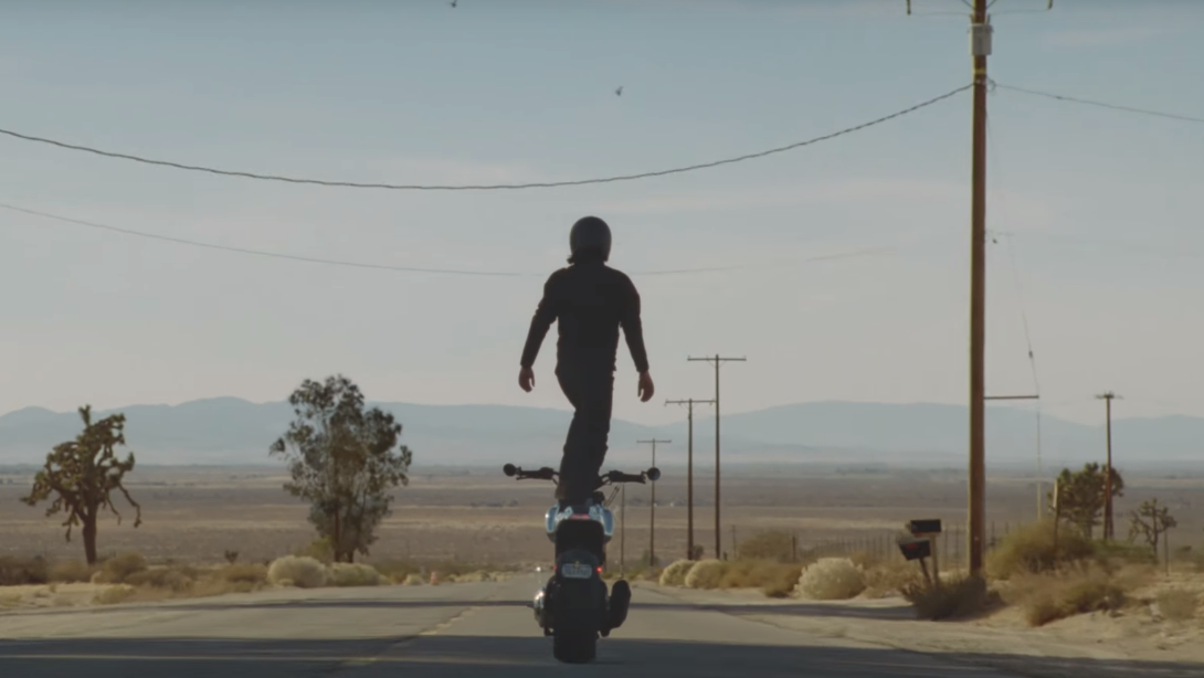 Why is Keanu Reeves standing on a moving motorbike and talking to himself?