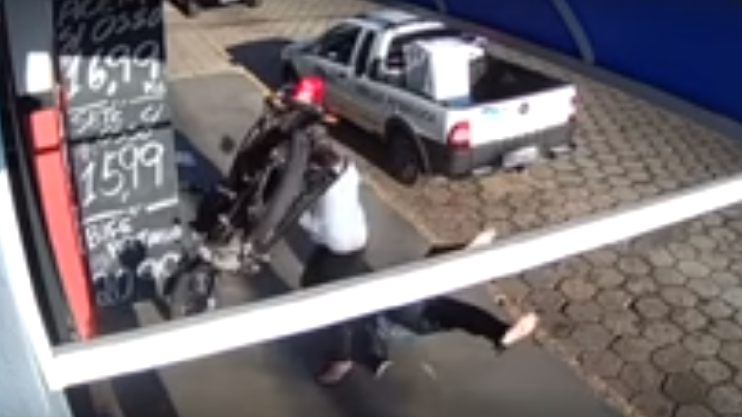 Incredibly, a woman standing in the flying bike's trajectory escaped with barely a scratch, and the rider had just minor injuries.