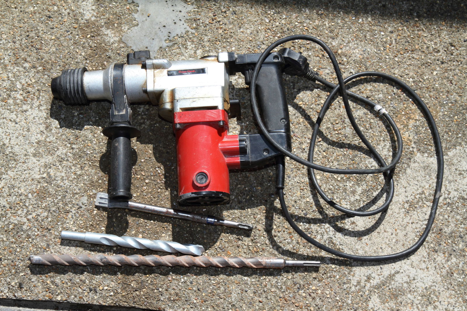 Gather some tools – you'll need a pretty tough SDS drill/chisel to make a hole in the ground, some ready-mix 'instant' concrete, and a normal drill to make the bolt holes in the garage door.