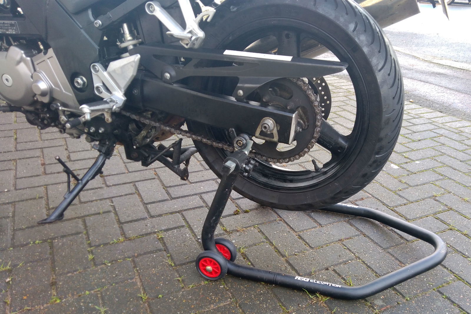 With the front and rear axle nuts loosened, lift the bike onto your stands. If you have a centre stand, put the bike on this, and use a small jack or front paddock stand to lift up the front wheel. Putting the centre stand on a thick piece of wood or a paving slab can give more ground clearance to get wheels out from under mudguards.