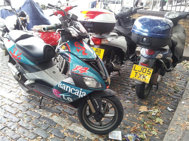 A few minutes later, he returns on the back of his mate's scooter. He hops off, wheels the bike into the road, hops on and his mate on the scooter puts his foot on the stolen bike's pillion peg and pushes the stolen bike down the road under the scooter's power.