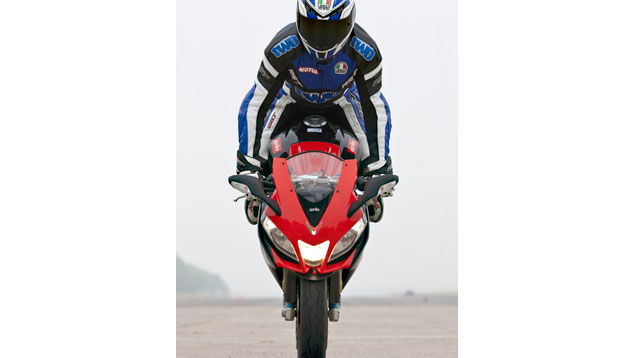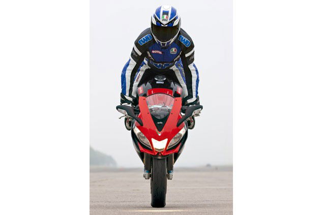 Keep doing this, gradually getting the wheel further and further up. You’ll need a bit more speed every time. If at any point you think the rear wheel is going too high, let go of the brake and it’ll come back down. Likewise if the front wheel starts to lock, release the brake lever. The action of letting go of the brake the moment you don’t feel right must become second nature. You’ll find this easier if you brake with two fingers and grip the twistgrip with the remaining digits.