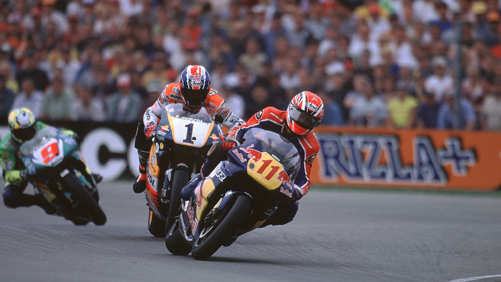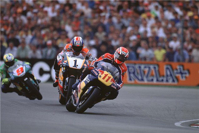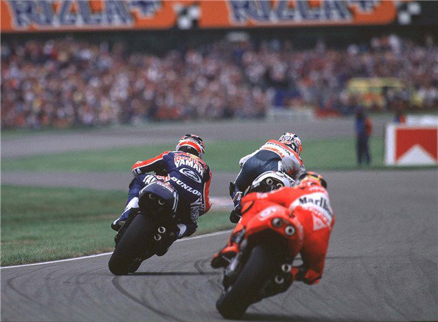 I got through toward the front of the group and could see Mick D had pissed right off at the front leaving a big gap. We were slipstreaming each other and all came to the braking point at the end of the fast main straight, side by side. There's Criville on the left, me in the middle and Barros on the right, we start braking and I think: 'Who's going to let go of the brakes first and get in there'. I let go and remember the fear mixed with adrenaline going into that very fast first turn... had I just pulled this off or was I about to take someone out?