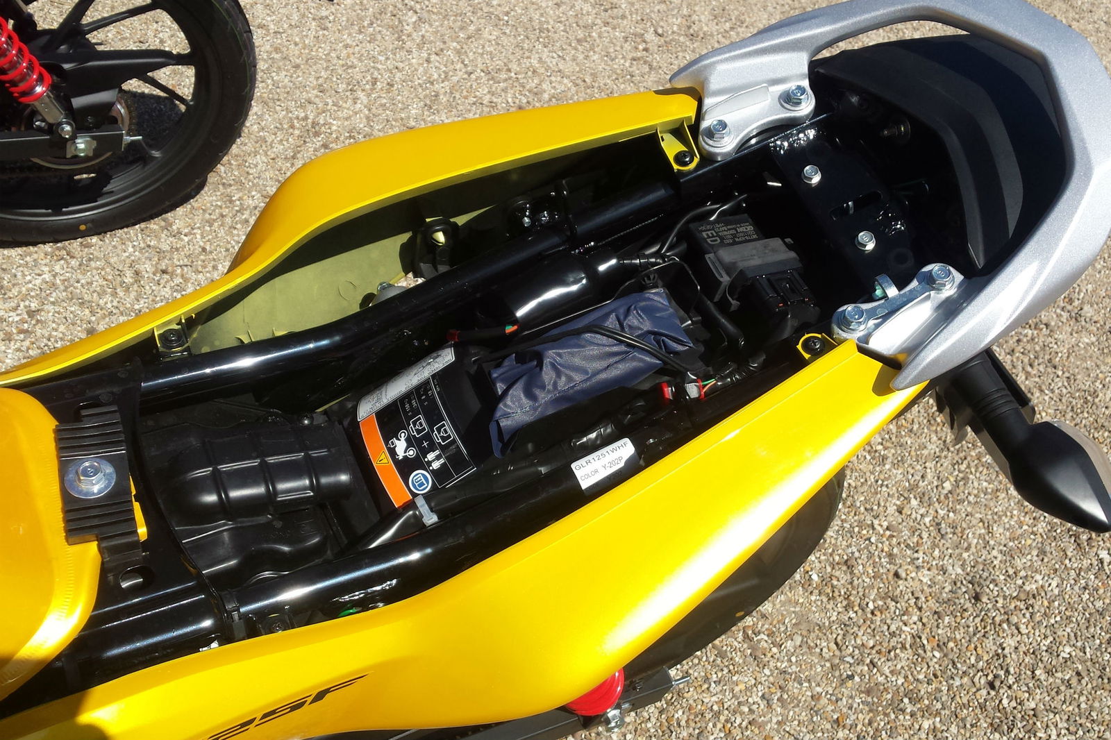 There's no notable under-seat compartment, although you might be able to wedge a disc lock in there somewhere, and you do get a small cable-type helmet lock in the tool kit.