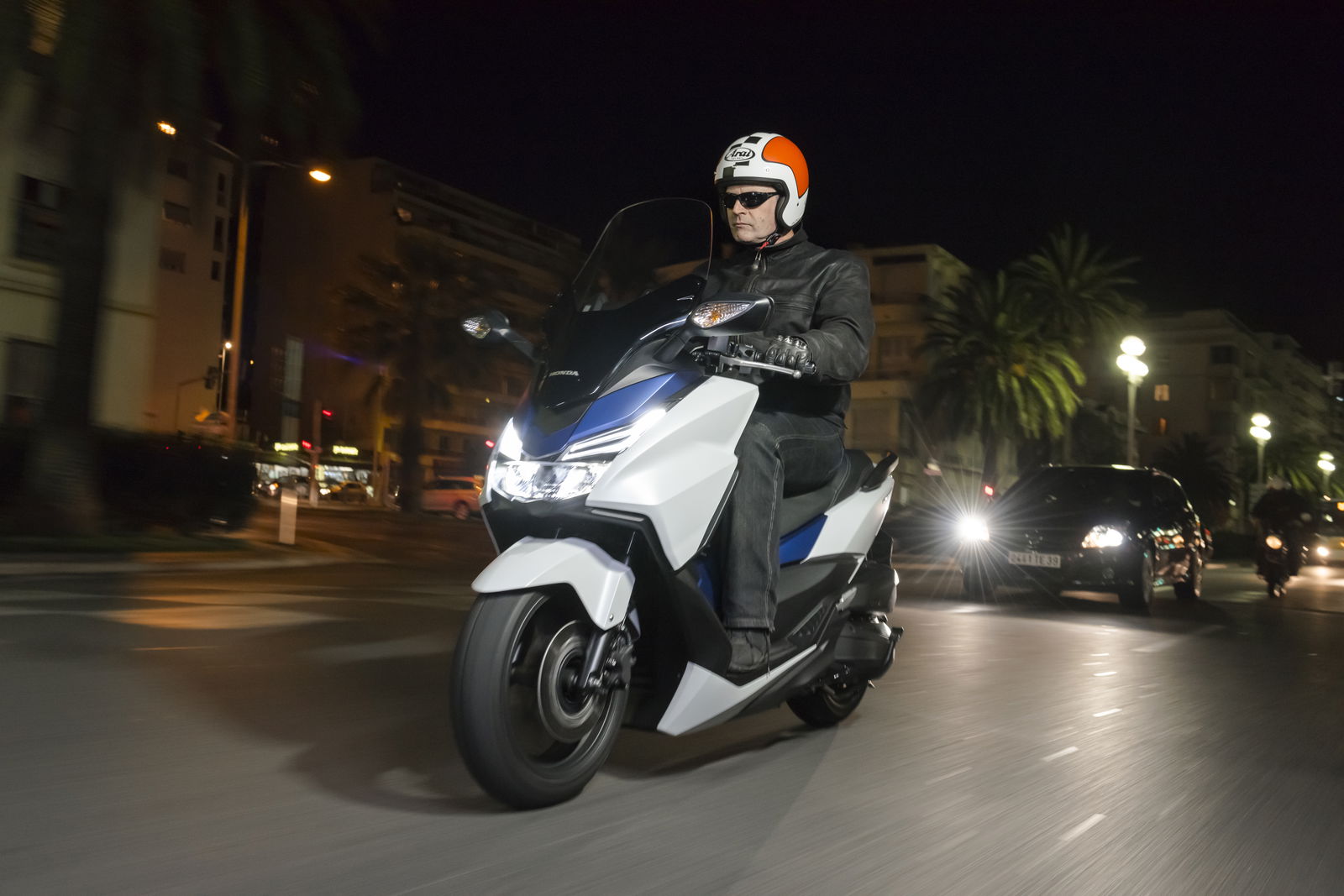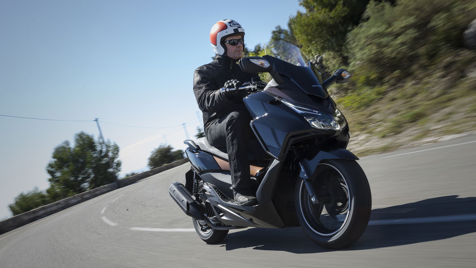 It may sound like the new Forza is adding up to one substantial, overly sophisticated machine, and a bit of a handful for newcomers, but from the saddle it’s anything but. Honda claims to have gone to great lengths to keep its newcomer light, lean and manageable, and it seems to have succeeded. Slide on board, rock it easily off its mainstand (there’s a side stand, too) and the Forza immediately comes over as an easily manageable, typical scooter. It’s lighter and less cumbersome than more usual maxi-scooters but at the same time decently proportioned and not as dinky as most 125s.