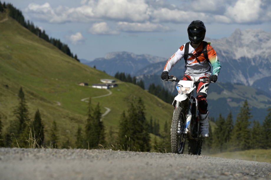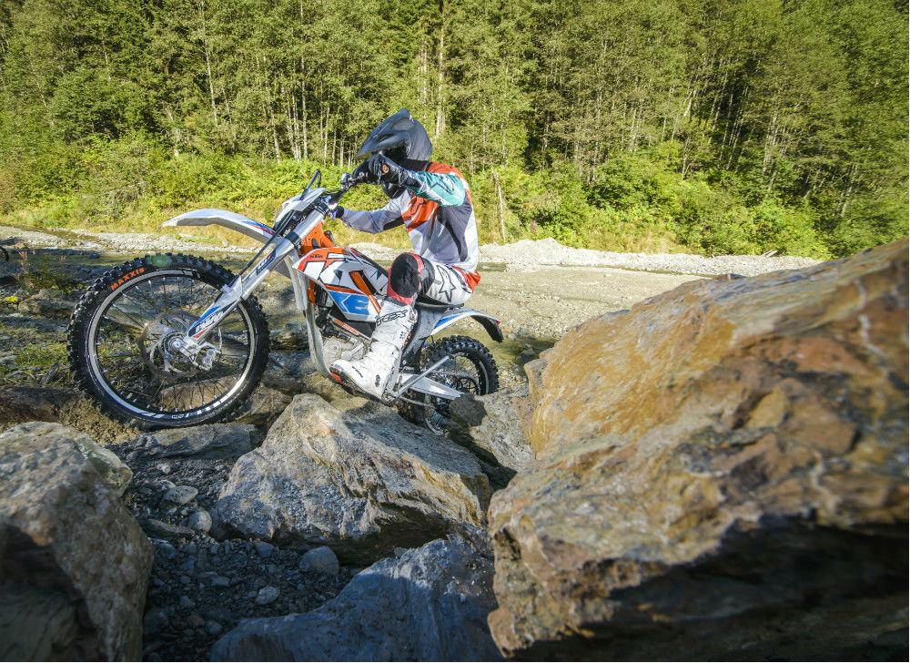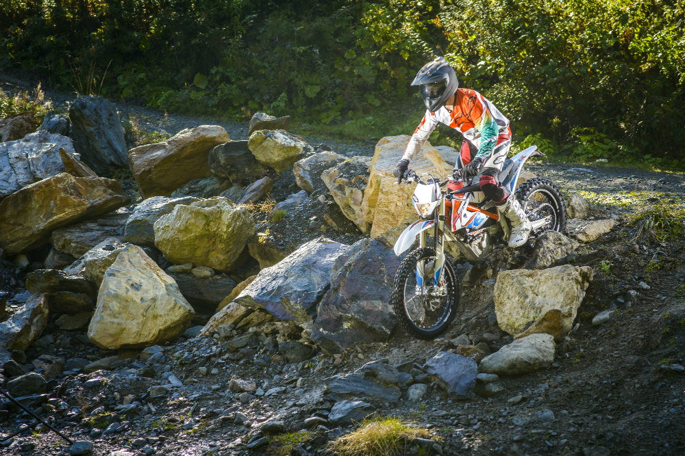 KTM opted for Maxxis tyres, an enduro one at the rear and a trials one at the front to provide adequate grip on both trails and tarmac. Even steep downhill sections littered with sizeable rocks and slippery roots didn’t phase the E, with plenty of grip provided by the 21” front and 18” back wheel. It seemed no matter what surface we rode on, the E was confidence-inspiring and above all, a lot of fun.