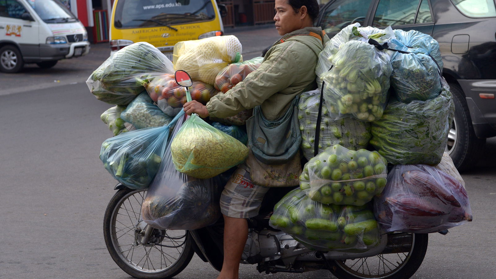 A Cambodian man is bringing home as much fresh fruit as his bike will permit. Which is a lot. Let's hope the route doesn't involve any corners.
