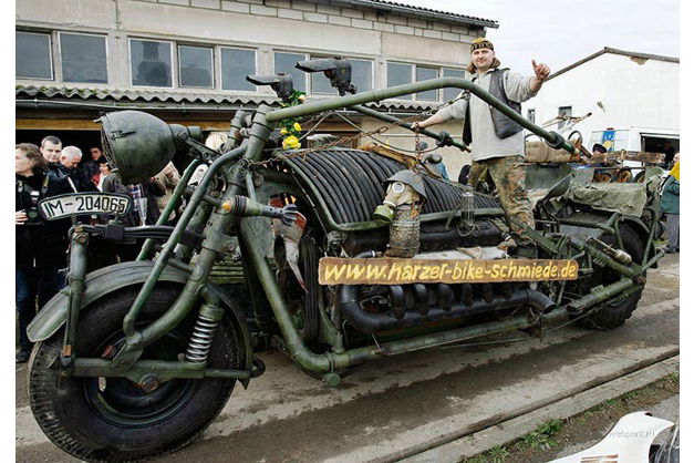 Weight is the motorcyclists’ enemy. It dents performance and harms handling so many are prepared to spend a small fortune stripping grammes away from their bikes. That’s not the path chosen by Tilo and Wilfred Niebel. Their creation uses a V12 engine from a Russian tank, which should be more than capable of shifting the bike, which tips the scales at a little less than five tonnes. Yes, it can be ridden.