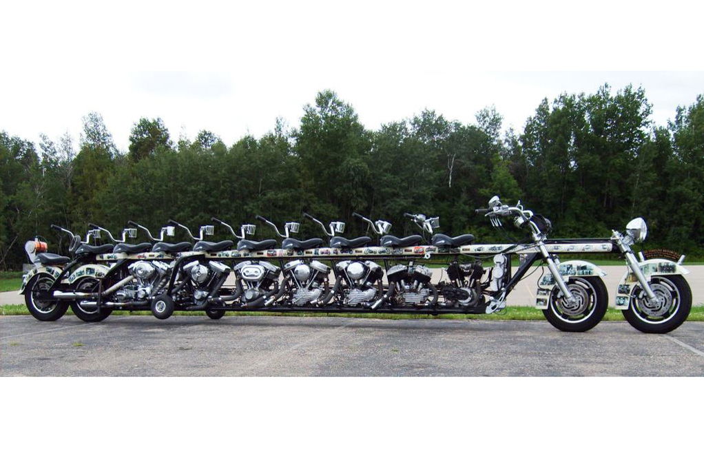 Did you know that you could once legitimately buy a four-seat motorcycle? The Czech-built Bohmerland, sold before WW2, accommodated whole families on the long bench of its Langtouren model. But even that is beaten by the creation of Steve ‘Doc’ Hopkins, owner of Doc’s Harley-Davidson in Wisconsin. His bike, called ‘Timeline,’ seats up to 10 people. And that’s not its only big number – there are also seven Harley engines in there, each from a different generation of Harley. From front to back there’s a 1923 1200cc JD, a 1944 1200cc Flathead, a 1946 1200cc Knucklehead, a 1948 1200cc Panhead, a 1981 1340cc Shovehead, a 1993 1340cc Evolution and finally a 2009 1584cc Twin Cam. The excessive numbers continue with the wheels – there are four main ones, two front and two rear, all in a line, plus a couple of removable stabilisers. And it all works.