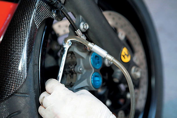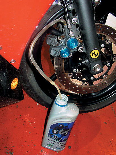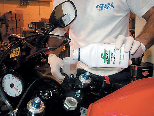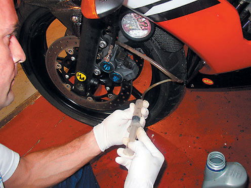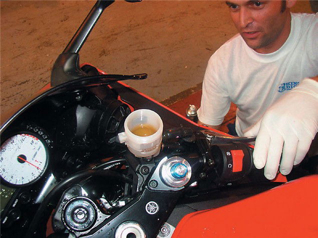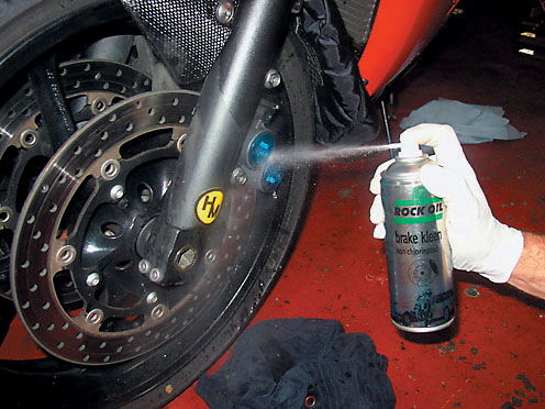 4. Tidy as you go, cleaning up any spillages with brake cleaner and a rag. Brake fluid is nasty stuff, so once a rag is soiled with some, bin it. You don't want to buff your tank with it by mistake