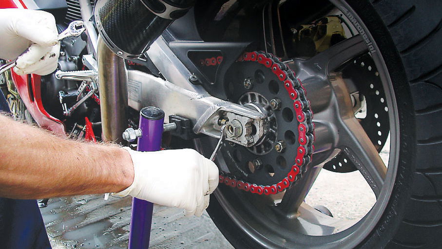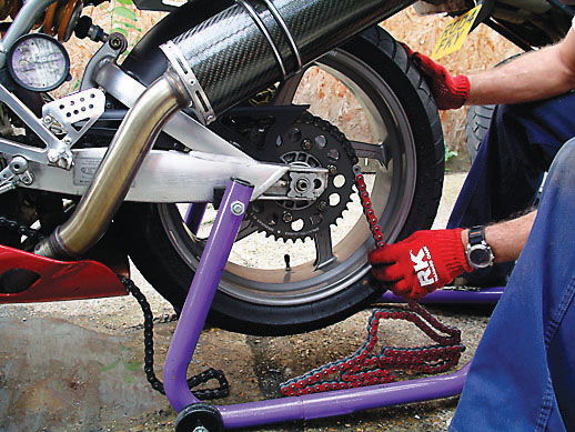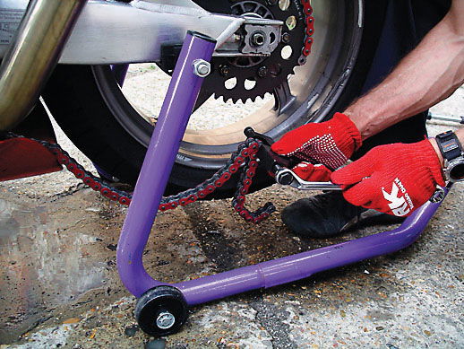 10 Everything back in place so tension the chain, get the bike off the main stand, do up the front sprocket, refit its cover, tighten the rear spindle and lube the chain.