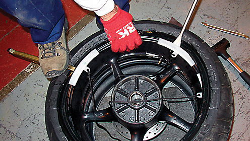 7 Being pikeys, we're fitting used tyres. Here, Daryll spots the Pirelli's rotation arrow. The red blobs of paint near it are balance marks, which must be fitted next to the valve.