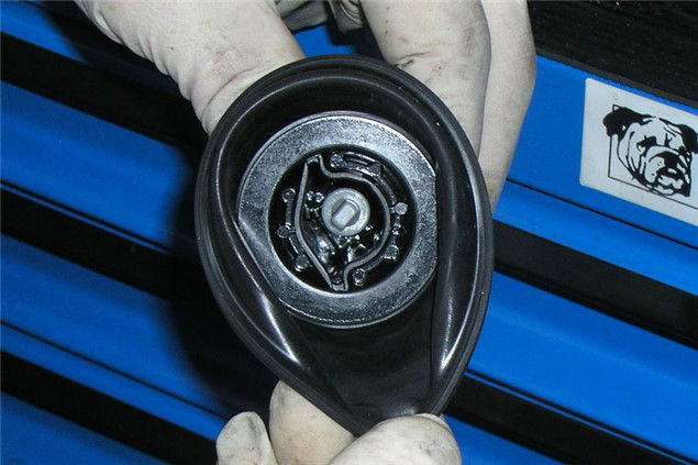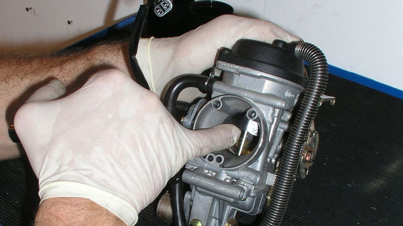 6 Assuming you have a CV carb undo the screws holding the hard plastic top on and carefully remove the rubber diaphragm. Check for tears in the rubber.