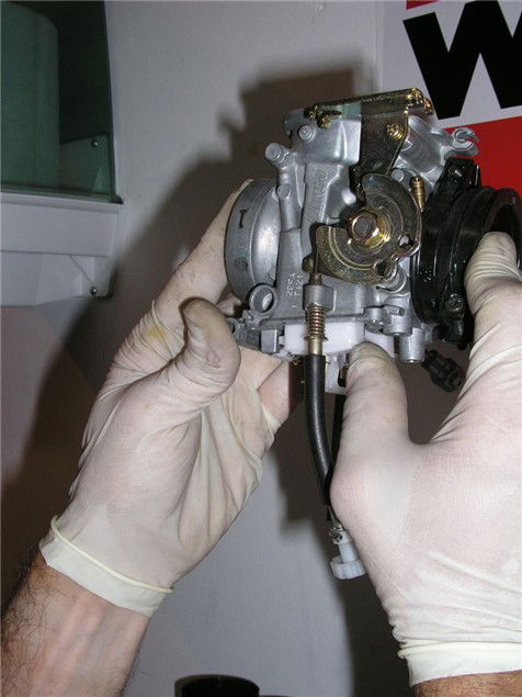 3 Drain the carb using the drain screw then disconnect the throttle cables. If you spill petrol on the floor mop it up straight away, don't have a fag and think about it!