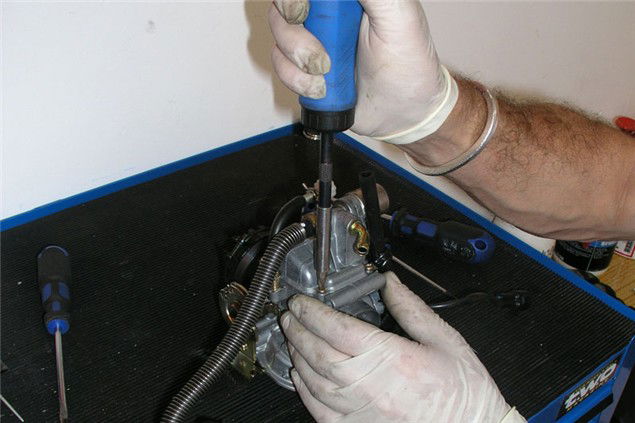 7 Turn the carb over and undo the four cross-head screws that hold the float bowl on. Take care, they are usually made of very soft metal and round easily. Clean the float bowl using carb cleaner.