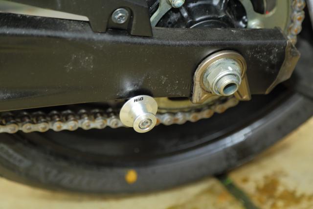 The bobbins are nicely made, and fit in literally seconds. Give the mounting holes on your swingarm a wipe down, and a quick squirt of WD40 or other lube spray, then bolt the bobbins into place with the supplied hex head bolts. Be careful not to cross any threads! Same other side and you’re boshed.