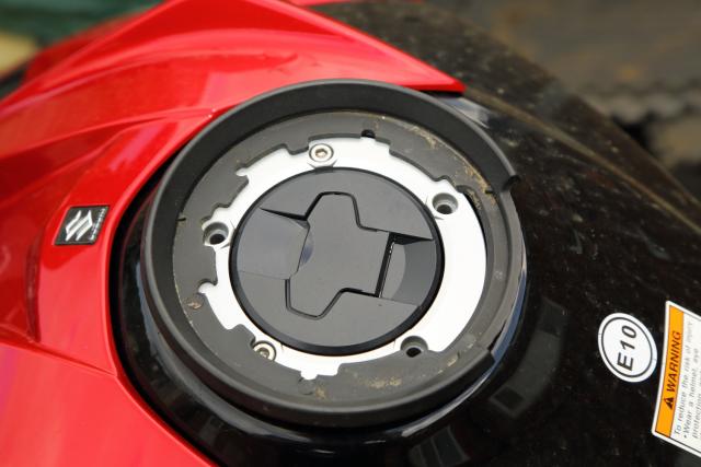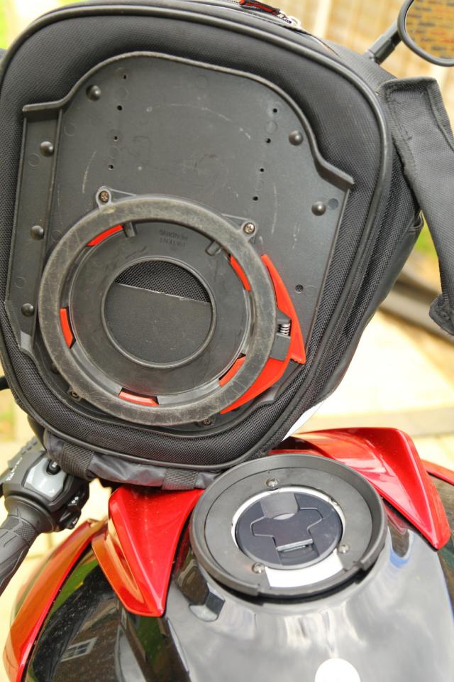 The Givi Silver tankbag is equally simple. remove three bolts from the tank cap surround, then bolt the mounting ring into place with the supplied bolts and spacers. Then, the bag just clips on and off at the press of a lever. I need to adjust the mounting ring on the bag a bit – it’s set quite far backwards from the previous fitting. But it’s just attached with the four screws you can see, and there are plenty of different positions to move it into, for the perfect fit on loads of bikes.