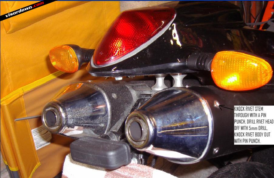 Drilled off the 3/16" diameter pop rivets from the end caps on the original exhaust silencers, (use/buy a cobalt 5mm drill bit to make it easier) and swapped the left cap with the right cap, so the bent outlet pipe in the middle of the std end cap sits inside the perf tube in the silencer.