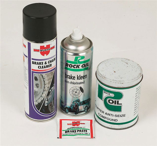 Before you start, make sure you have everything you need to complete the job. So that'll be a new set of pads for a start. Second, have a look over the bike's brakes and see what you'll need to remove the calipers and the pads themselves - usually a couple of 12mm bolts holding the calipers to the forks and a hexagonal or Allen-headed pin or two holding the pads themselves in place. You'll also want some bits of rag, brake cleaner, soapy water (if the calipers are in a right state), high temperature lubricant such as copper grease, brake paste (if you can get hold of it), a bungee cord and an old toothbrush.