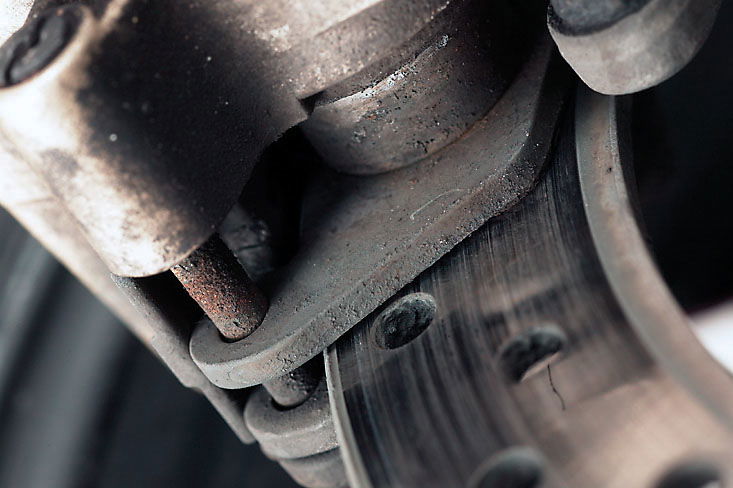 If the caliper is really crud-encrusted, clean the worst of the muck off with soapy water. Afterwards, use brake cleaner and an old toothbrush to clean up the exposed pistons, the holes the pad retaining pins slide through and the anti-rattle shims.