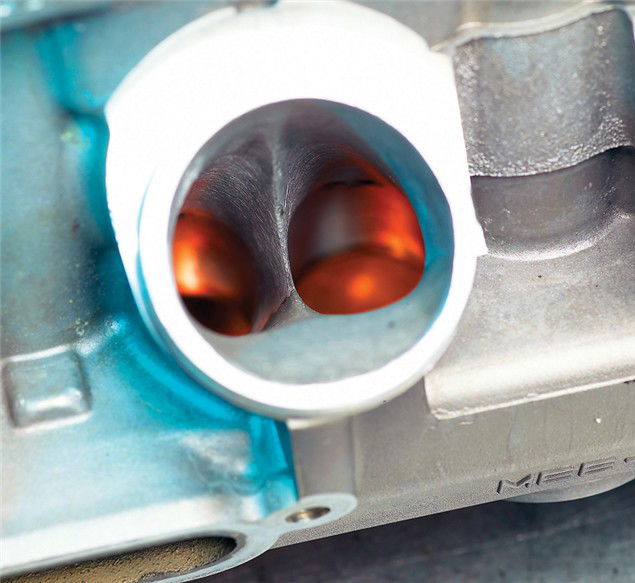 Big ports obviously flow more gas, but simply widening the inlet tract as far as the cylinder head allows isn't the answer. In fact, narrowing the standard inlet port can reap benefits. An FW Developments supersport-spec CBR600RR actually has narrower inlet ports with a different shape to standard, with material added to the cylinder head which is then ground away and reshaped to the desired dimensions.
