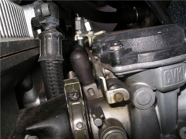 The first job is to access the carbs and inlet manifolds, which will usually mean lifting or removing the fuel tank. If there is no way to keep the fuel tank connected you'll have to rig up a slave supply of fuel. An old Fairy Liquid bottle with the bottom cut out and hung from the ceiling will do, connected to the fuel inlet with a length of pipe. Next locate the vacuum take-off points, which will either be located on top of the carbs or screwed into the inlet manifolds. Carb-top vacuum take-off points are accessed by removing their black rubber caps; if the take-offs are located on the inlet manifolds they will have a small blanking screw and washer fitted. Remove them. If your bike has a vacuum operated fuel tap, at least one of the take-off points will have a pipe connected to it which returns to the fuel tank. If you're leaving the tank in situ you will need to disconnect the pipe, suck the air out of the pipe then clamp it to create a vacuum which will open the tap.