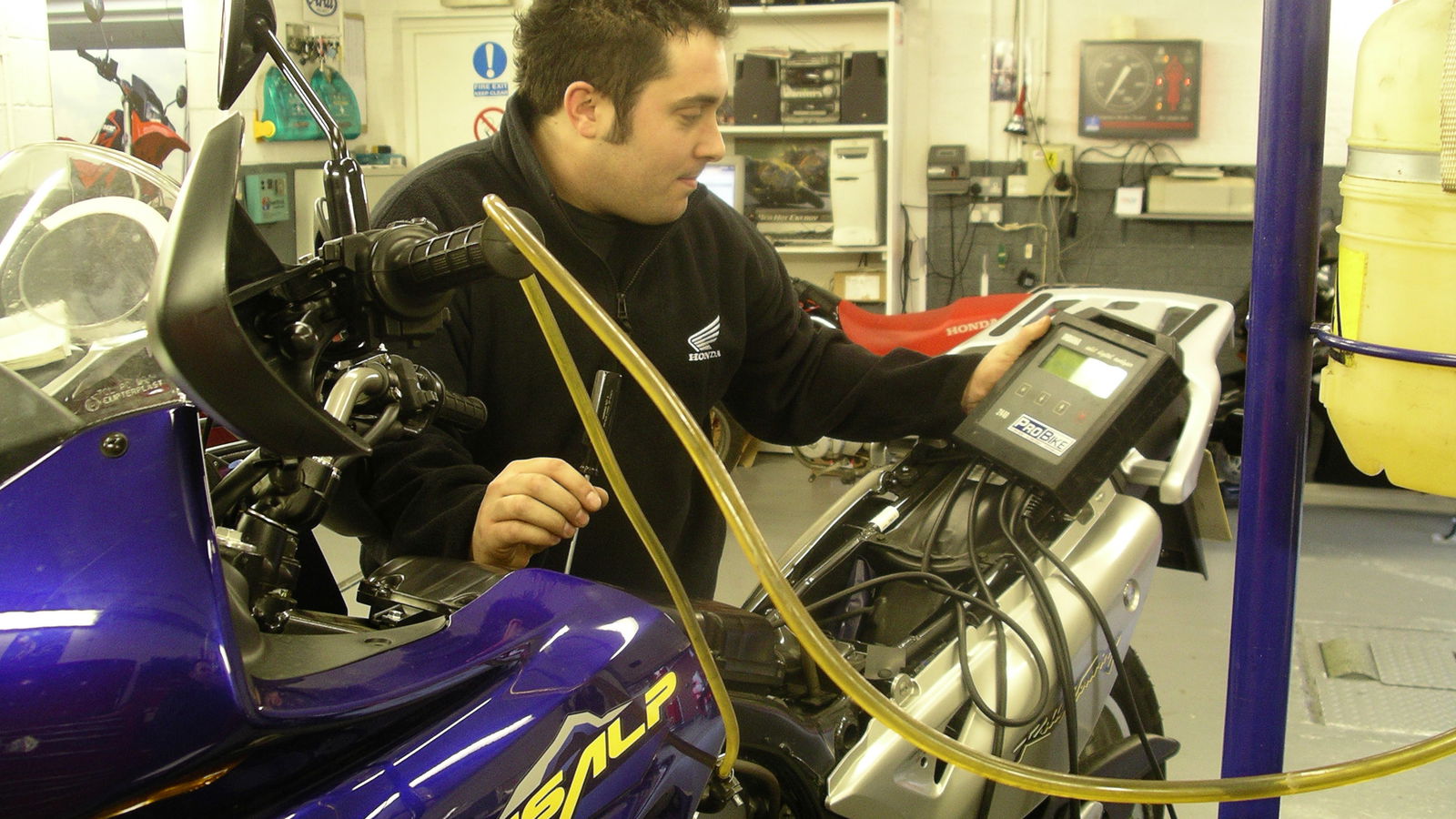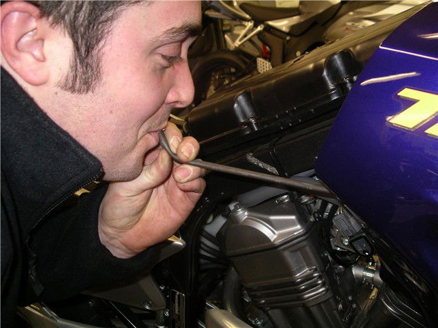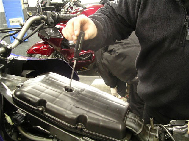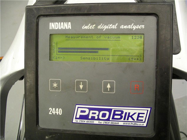 Your carb balancer will come as a kit with a selection of threaded tubes, which are screwed into the inlet manifolds. With the take-off points prepared attach the carb balancer pipes to the relevant take-off points and start the engine. It's vital the pipes are fitted well - any leaks will give you a false reading. It is also important to let the engine get up to normal running temperature, ie off the choke. Study the screen or dial gauges to see how far the carbs are out of synch. There is no need to adjust every carb as one will always be the 'base' carb, usually the one with the throttle cable(s) and tick-over adjuster fitted. Once you have decided which carb is the base carb you will need to locate the spring-loaded adjuster screws on the remaining carbs. In the case of the TransAlp pictured the adjuster was accessed through a hole in the top of the air box. By turning the adjuster screws individually you will be able to balance the carbs until the screen or dials read the same. If the screen or dials are flickering you may need to adjust the sensitivity of the gauge by pressing the sensitivity button or adjusting the damping screws located at the top of the pipes. When you're satisfied the carbs are in synch, turn the engine off and disconnect the gauges, remove the fitting tubes and replace the blanking screws and washers. Finally, if you rigged up a slave tank it's a good idea to let the engine cool down before removing the supply and refitting the fuel tank.