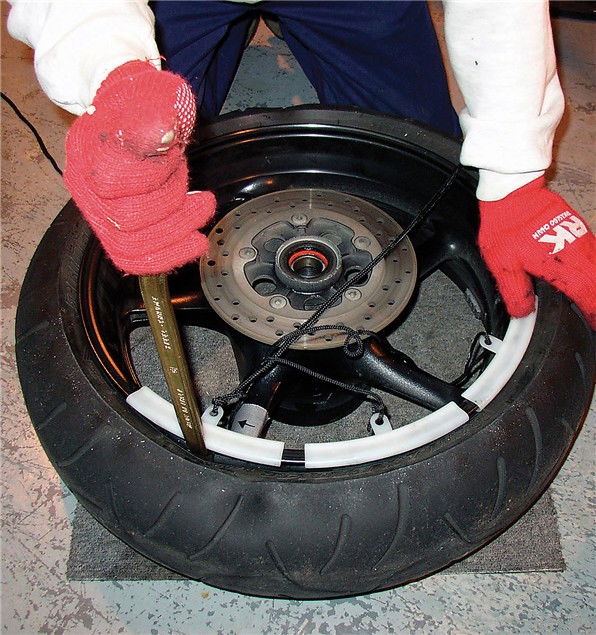 Once you have removed the wheels, note their direction of rotation. Almost all tyres will have a direction arrow stamped on the sidewall. In some cases the wheel will also have an arrow cast onto one of the spokes. If not, stick a piece of tape to the rim with an arrow noting the direction of rotation.
