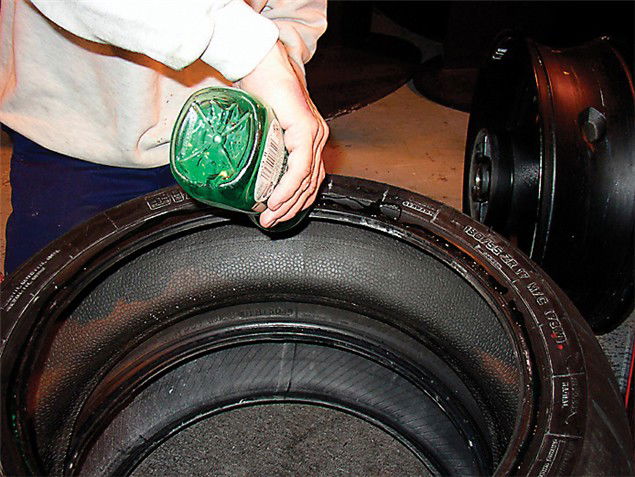 Once on it will need to be inflated. If you don't have a compressor, visit your nearest fuel station. With the valve still out inflate the tyre until both tyre walls pop onto the rims. You may need to inflate it up to 50 or 60psi to get the wall to seat. As soon as it has, remove the inflator and allow the tyre to deflate. Re-fit the tyre valve and re-inflate to the recommended pressure. Check all the way round the rim where the tyre meets it, making sure it is evenly seated, that the balance marks are in the correct place and the tyre is on the right way round. If you used washing-up liquid to lubricate the tyre during fitting, rinse off all trace of it.