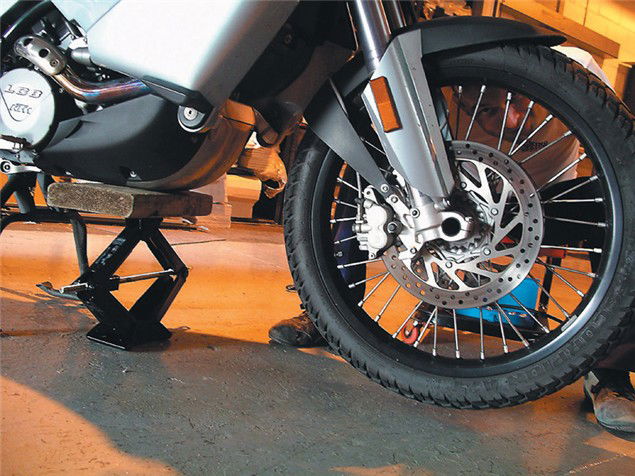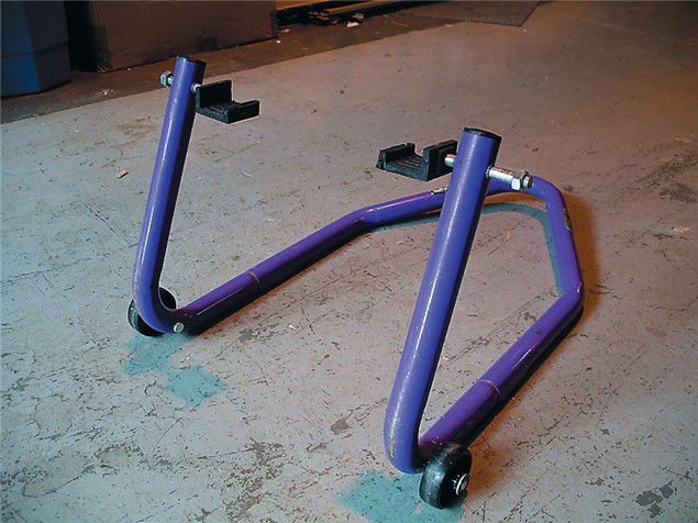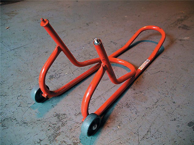 Next get your bike supported so both wheels can be removed without the rest of the machine toppling on you or innocent bystanders. If your bike has a centrestand this is pretty easy; if you own something modern and sporty-ish chances are all you'll have is a sidestand, so you'll need to sort yourself out with front and rear paddock stands. Don't baulk at the initial expense - a rear one is pretty essential anyway for chain maintenance if nothing else, while front and rear stands together will save money in the long run for jobs such as this and other, more exciting, projects.