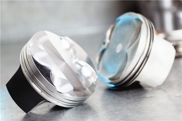 Whichever way we go about it boosting the compression ratio is an easy route to more power. High compression pistons are, according to FW Development's Ian Park, "bolt-on horsepower". Modern bike engines tend to run compression ratios in the 10:1 to 12:1 region. By way of an example, a standard CBR600RR has a 12:1 compression ratio, while an FW Developments supersport-tuned RR will run at around 15:1.