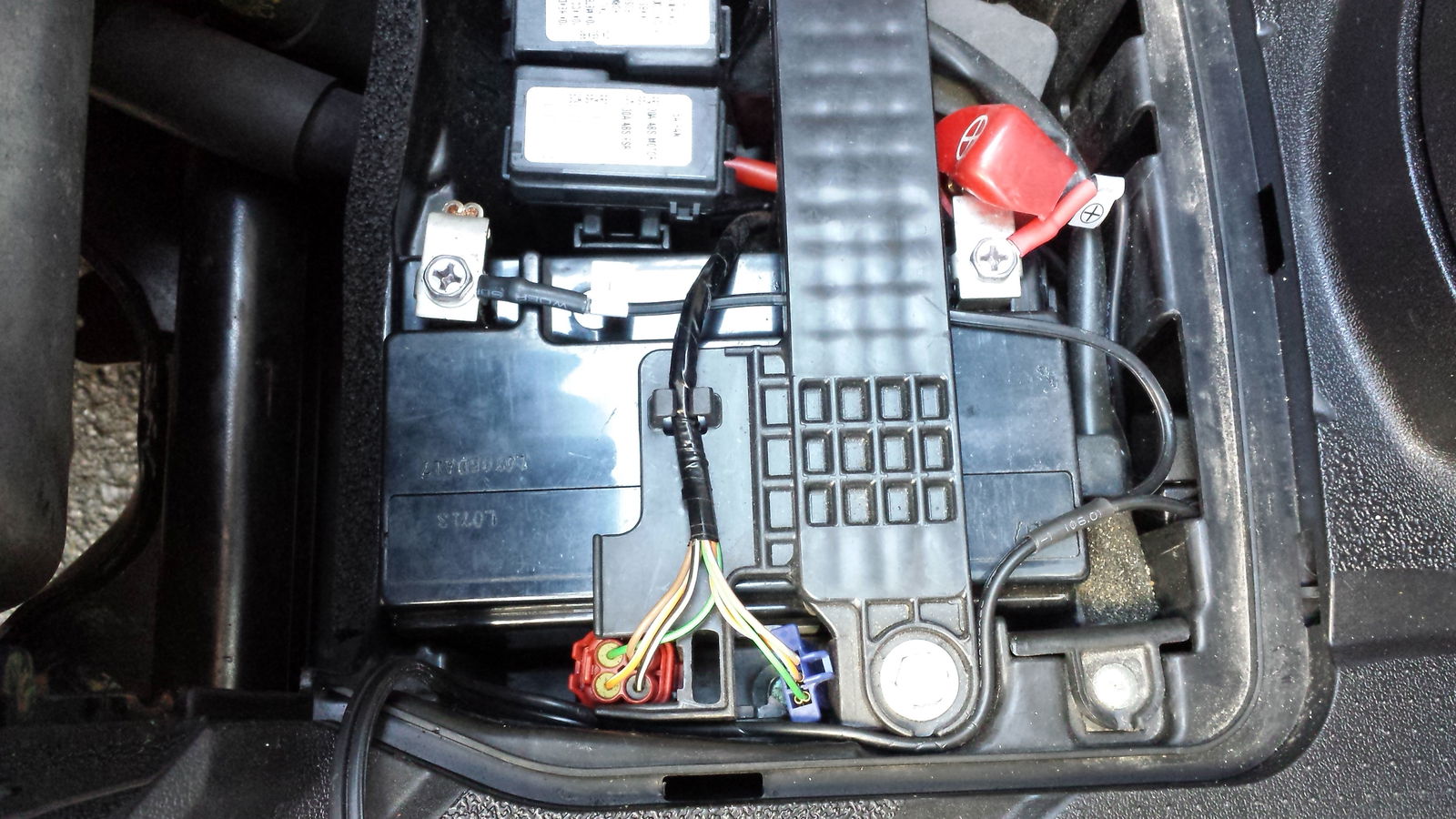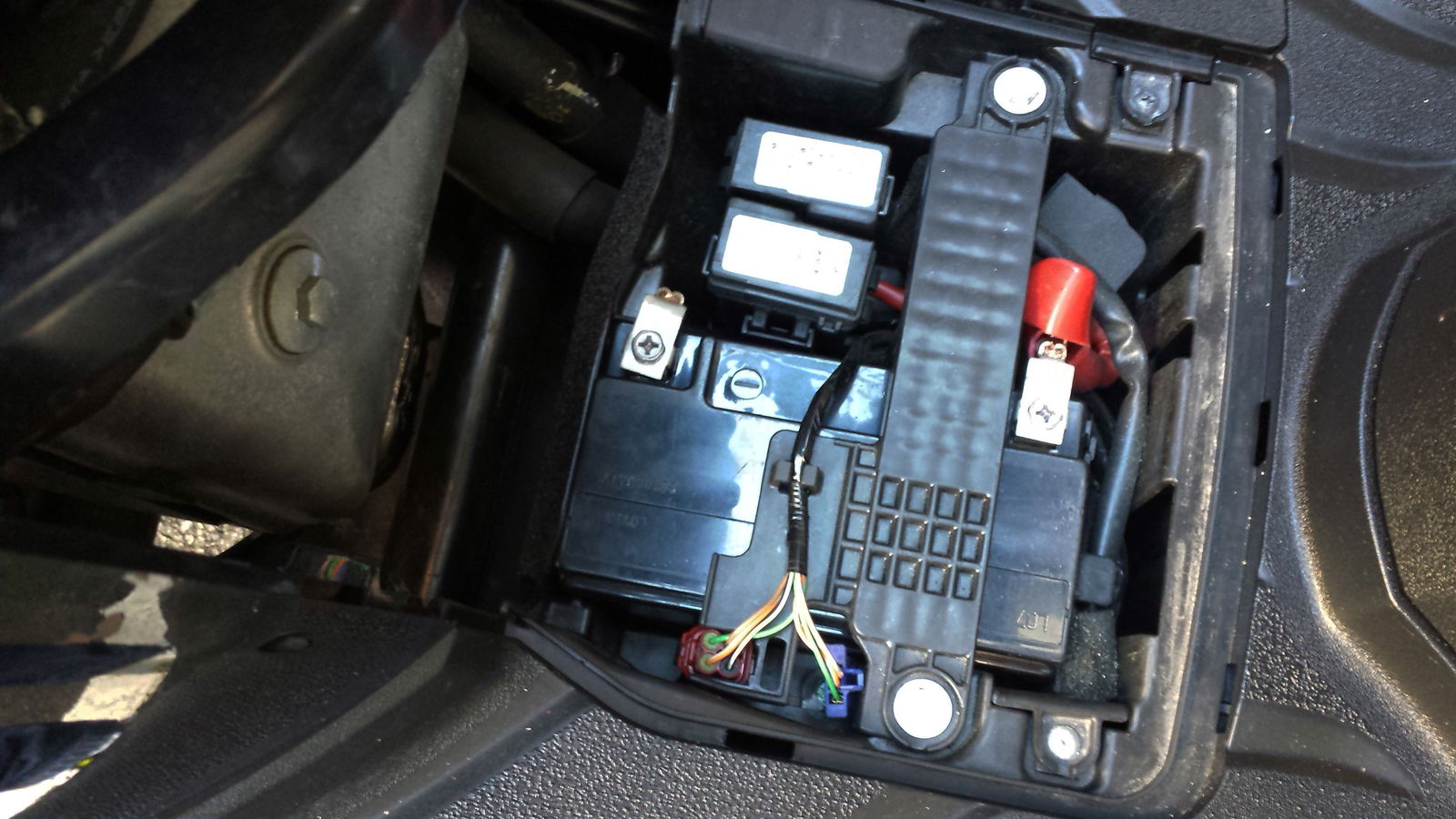 Step 2: There's plenty of room under the battery cover to run the cables, so you could just connect it up and off you go, but if you remove the bar holding the battery then you can neatly route the cables. I've tucked the slightly bulky fuse in the little hole on the right.