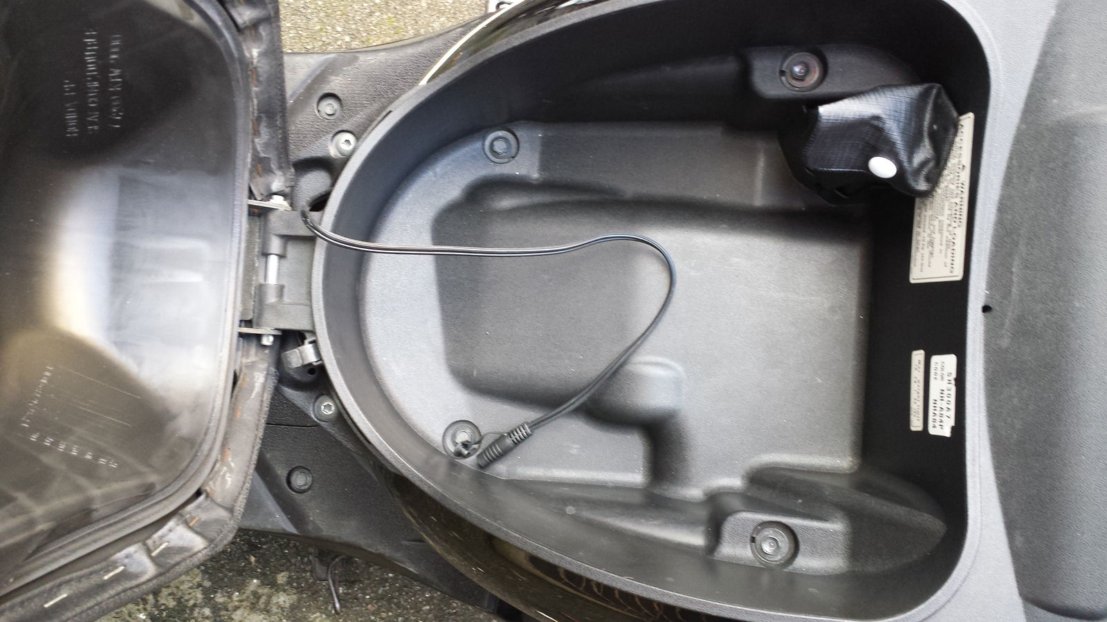 Step 3: The battery cover has a decent gap at the top where it meets the seat, plenty of space to run the cable through and into the underseat storage. Once the battery cover is in place. If you want to, you could drill a small hole in the bottom of the underseat storage and run the cable through that but I see no real need. When you're not using the heated vest, you can pop the seat and sling the end of the connector in there.