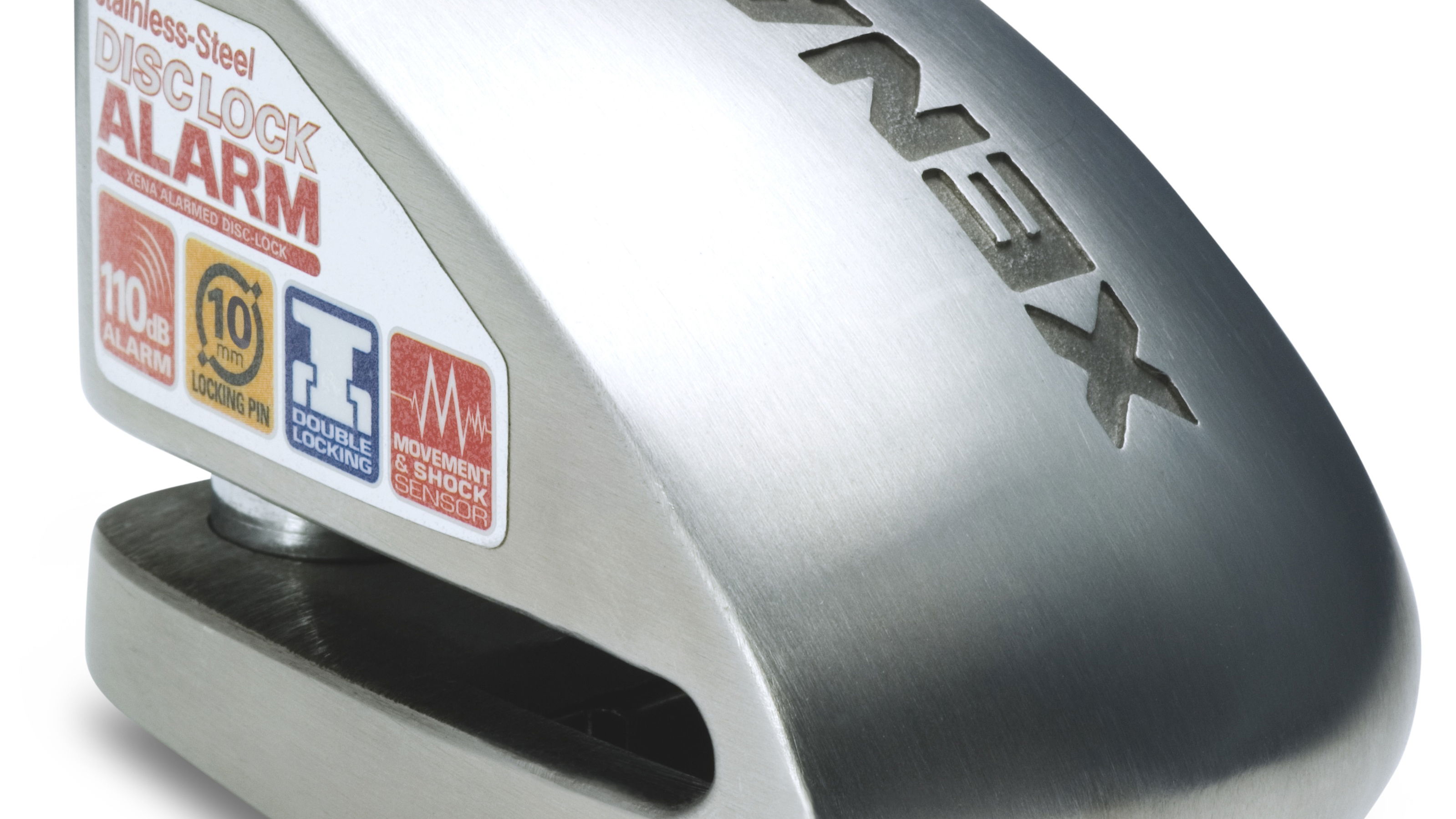 XX10 review Very High Security High-grade chro-moly steel mono-block construction and piercing 120dB alarm make the high-performance XX10 White a remarkably effective way to protect your motorbike. Lock: Featuring a sport and streetbike-oriented fit profile with 10mm double-locking, carbide-reinforced hardened-steel locking pin and pick-proof, freeze-spray proof key and barrel. Alarm: Shock & motion sensors trigger a piercing 120dB anti-theft alarm powered by a single CR2 Lithium battery. Self-arming, with no on-off switch, re-sets to armed mode within 15 seconds.